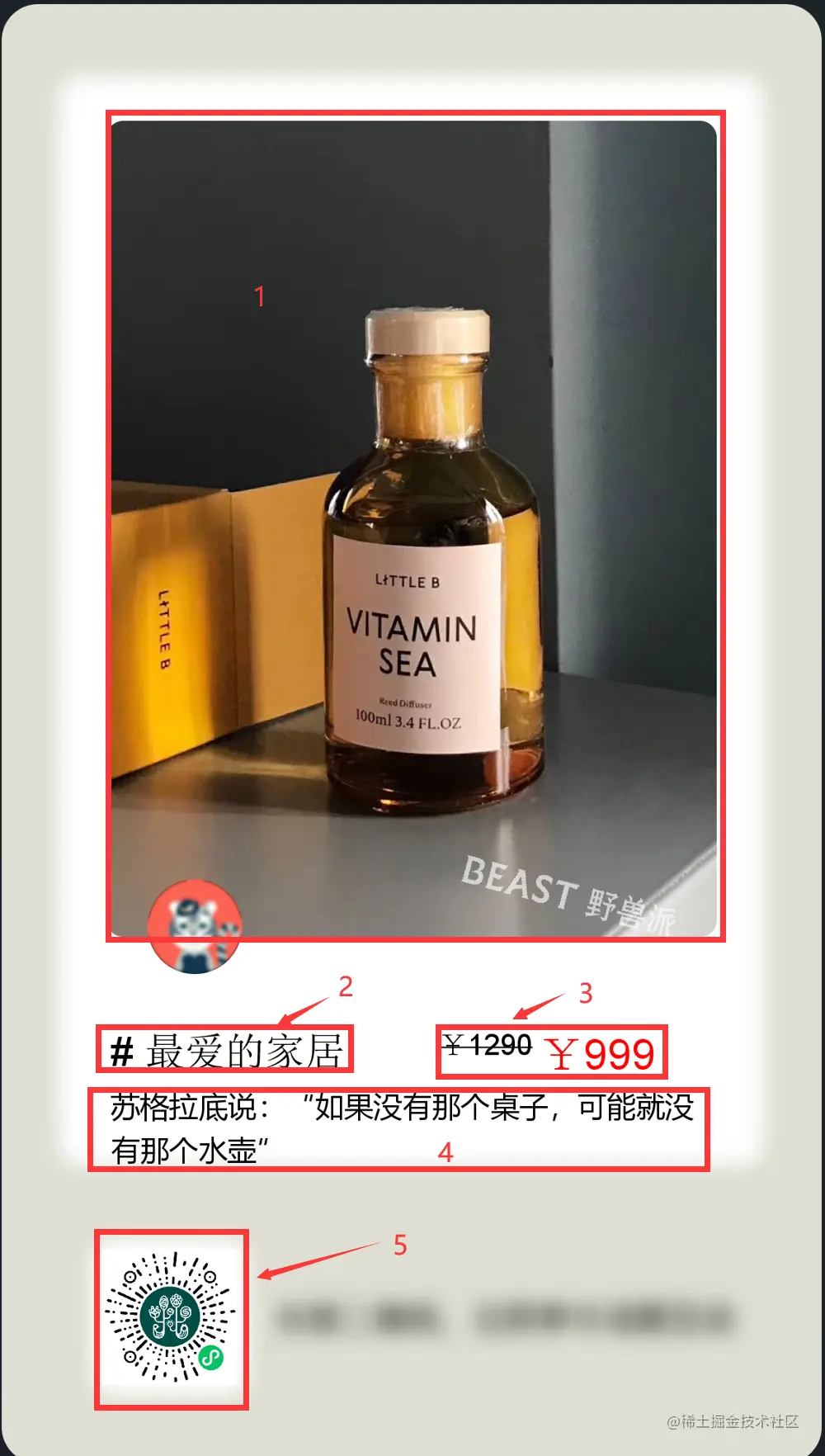 针对上述的宣传海报进行了分区,并用数字1-5号进行标记,1号一般用于宣传海报上的主要目标图片,2号一般是商品的名字,3号可以使价格,4号位置通常会对商品或者活动信息进行简单的描述,5号位置可以预留给二维码等信息,这里我们忽略了一个基本需求,就是海报有一个最基础的背景,所以在制作海报前首先还应该准备一张基本的背景图。针对上面这种需求,结合代码应该怎么进行实现?
