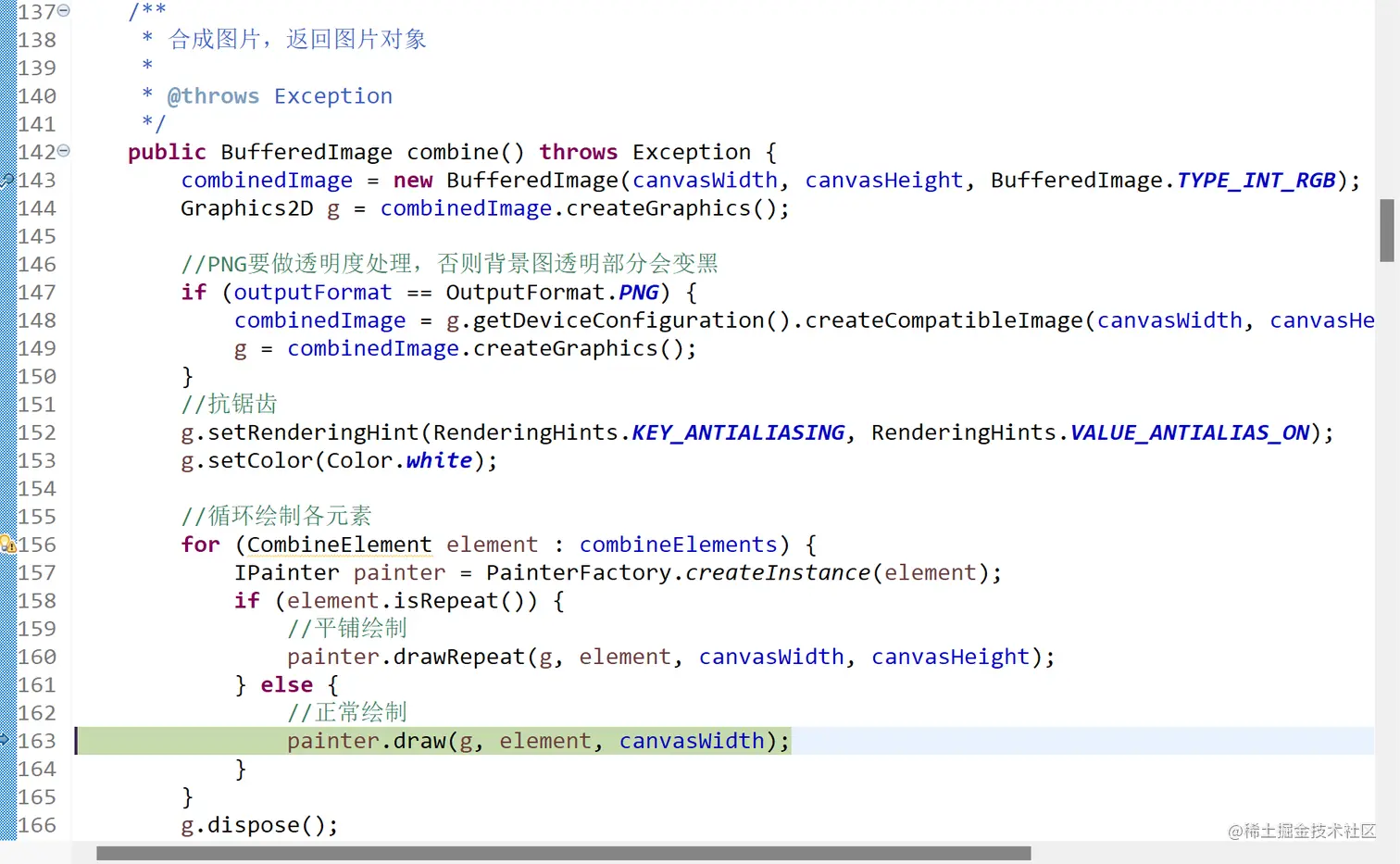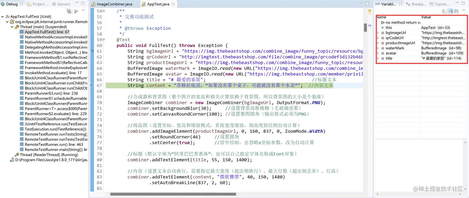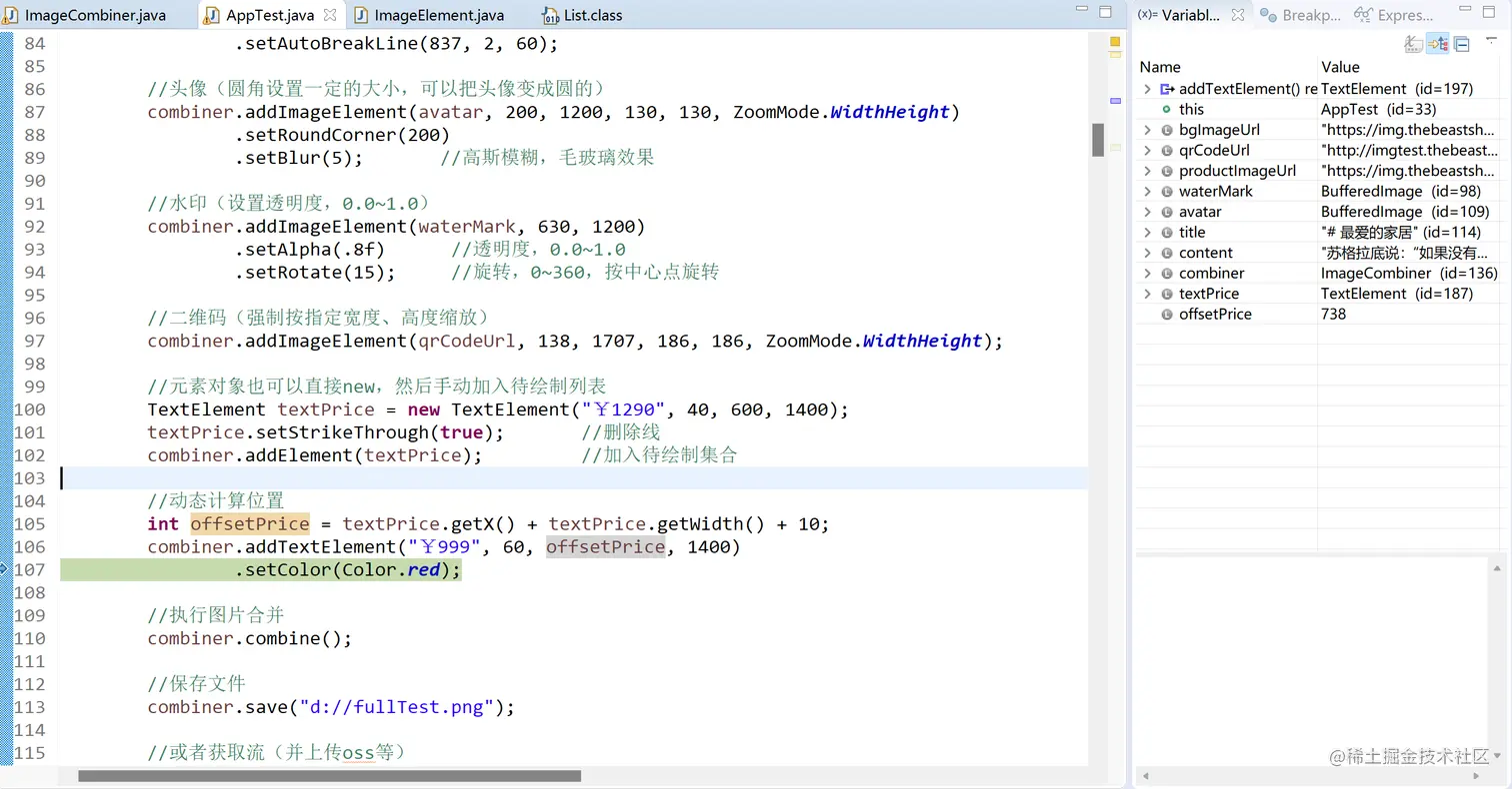 打开test目录下的AppTest.java类。这里以一个面比较全的方法类说明image-combiner的主要用法。选取的代码如下: