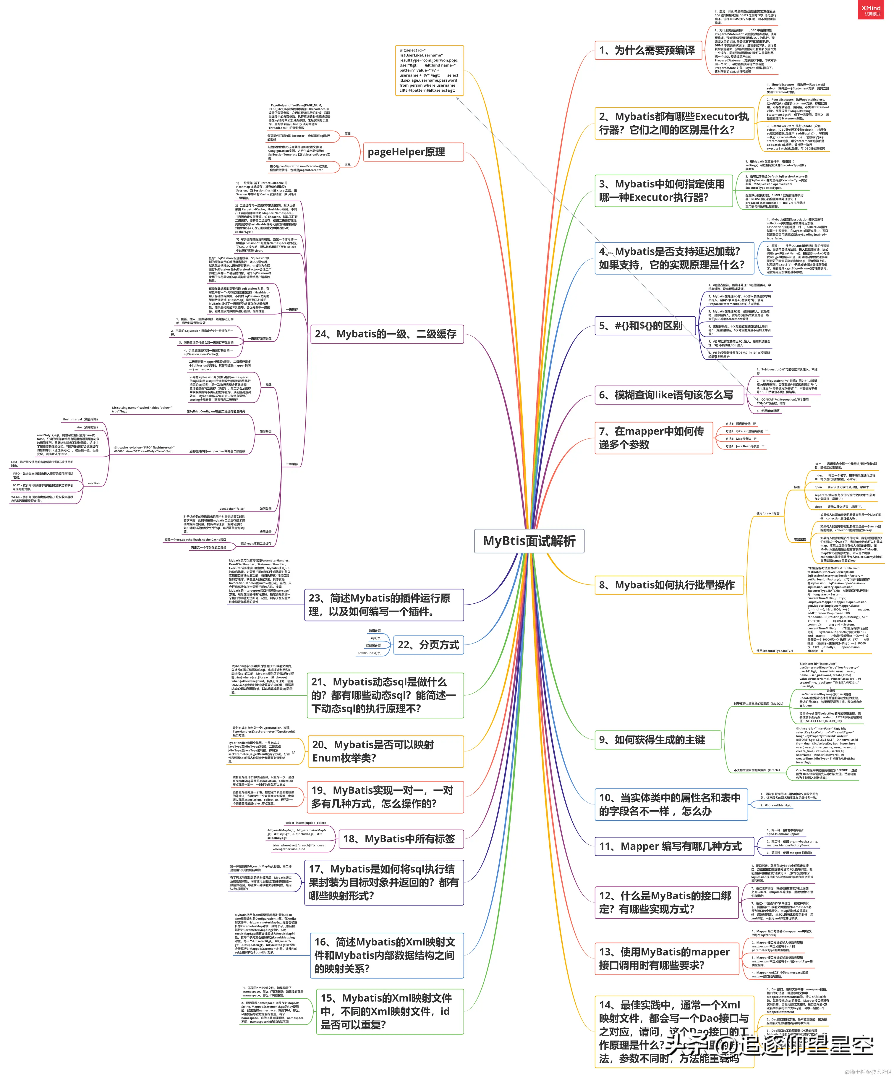 学完之后,若是想验收效果如何,其实最好的方法就是可自己去总结一下。比如我就会在学习完一个东西之后自己去手绘一份xmind文件的知识梳理大纲脑图,这样也可方便后续的复习,且都是自己的理解,相信随便瞟几眼就能迅速过完整个知识,脑补回来。下方即为我手绘的MyBtis知识脑图,由于是xmind文件,不好上传,所以小编将其以图片形式导出来传在此处,细节方面不是特别清晰。但可给感兴趣的朋友提供完整的MyBtis知识脑图原件(包括上方的面试解析xmind文档)