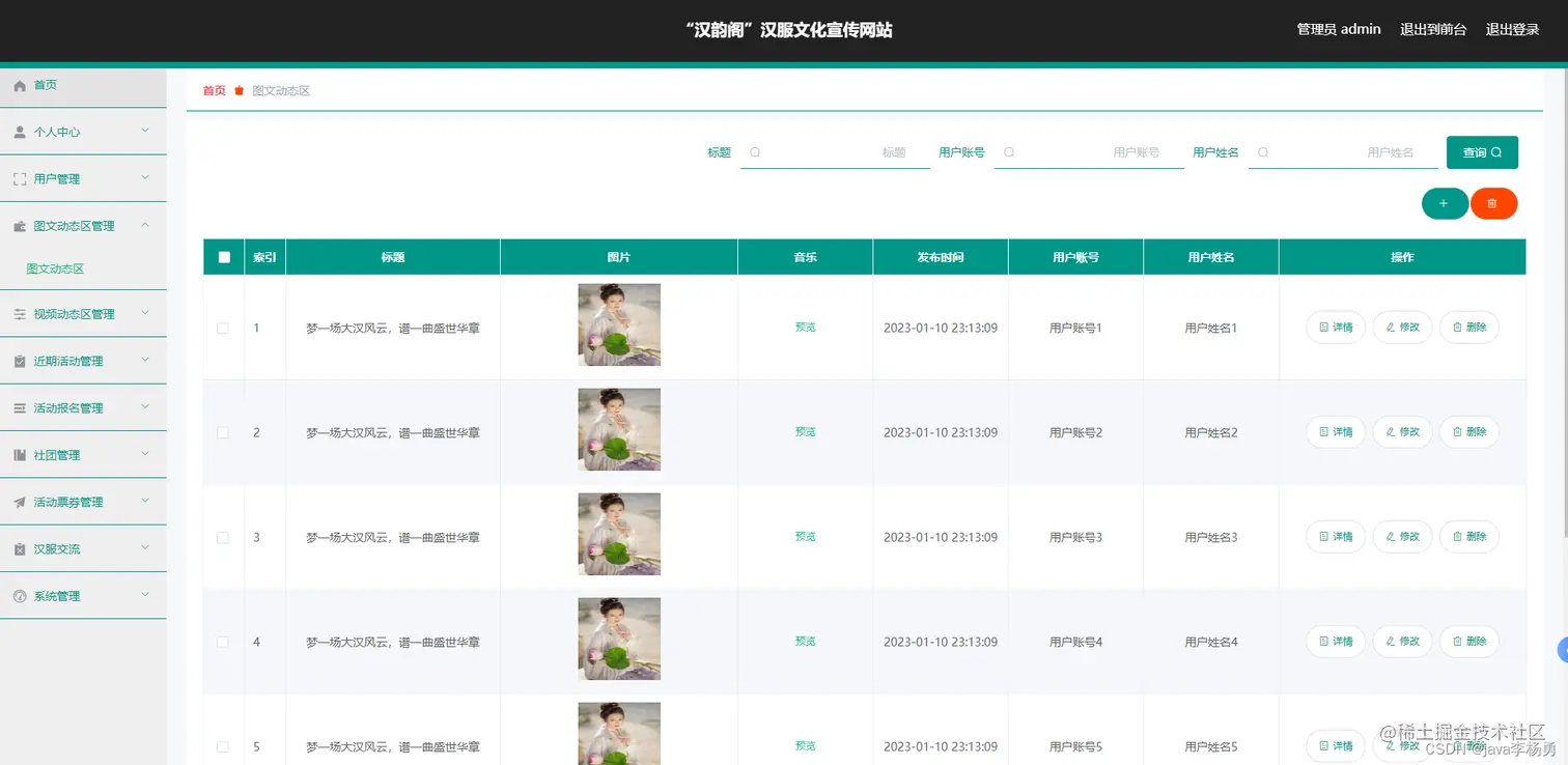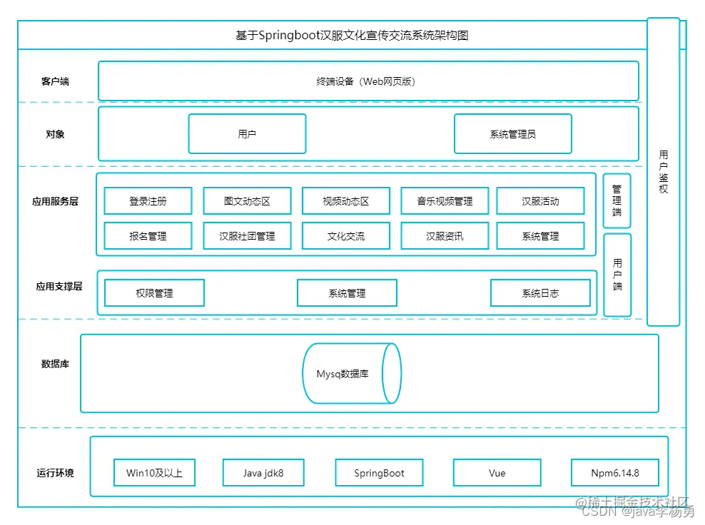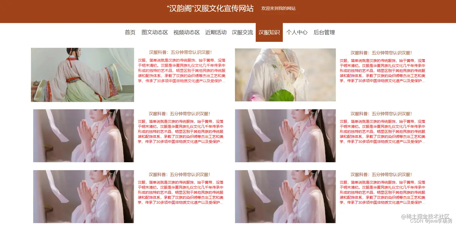 随着我国国民知识水平的提高和一些大学生等人群的喜欢,国风汉服文化也逐渐的再次出现在了我们生活中的个个角落中,很多高校甚至出现了汉服社团等团体,与此同时还是有很多人对汉服的了解不足,为了能够让更多的人对我国的这一非物质遗产有更多的了解,我们通过Springboot和MySQL开发了本次的国风汉服文化交流宣传系统。系统主要采用JAVA语言进行设计实现、JAVA语言是目前软件市场上应用最广泛的语言开发程序。可以在多种平台上运用的,兼容性比较强,适应市面上大多数操作系统,不会出现乱码的现像,其扩展性和维护性都更好,具有分析问题和解决问题的能力,是面向过程的程序设计方便我们编写的代码更强壮。