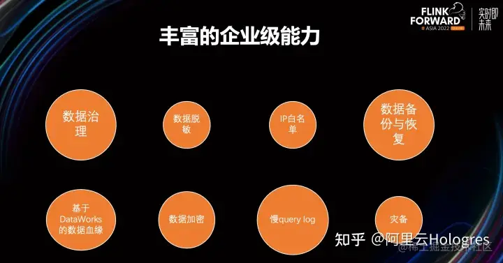 除此之外,Hologres的定位是一站式的企业级实时数仓,所以除了上述能力,我们还有很多其他能力。包括数据的治理、成本治理、数据血缘、数据脱敏、数据加密、IP白名单、数据的备份和恢复等等。