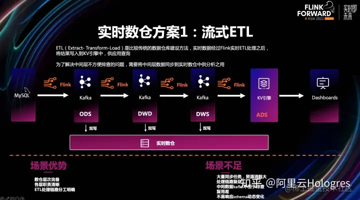 ETL(Extract- Transform-Load)是比较传统的数据仓库建设方法,而流式ETL就是指:实时数据经过Flink实时ETL处理之后,将结果写入到KV引擎中,供应用查询。而为了解决中间层不方便排查的问题,也需要将中间层数据同步到实时数仓中供分析之用。最常见的做法就是数据通过Flink清洗后,写到Kafka形成ODS层。再从Kafka消费,经过加工形成DWD层。然后Flink加工成DWS层,最后通过加工形成ADS层的数据写到KV引擎并对接上层应用。因为直接使用Kafka数据进行分析和探查很麻烦,所以也会同步一份Kafka数据到实时数仓,通过实时数仓进行分析和探查。