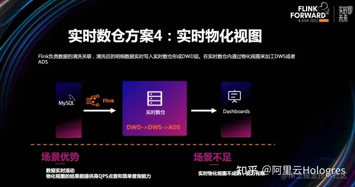 第4种方案就是通过实时数仓的物化视图能力实现数仓分层。常见的做法就是Flink实时加工后,将数据写到实时数仓形成DWD层,DWS层或ADS层的构造依赖于实时数仓的实时物化视图能力。