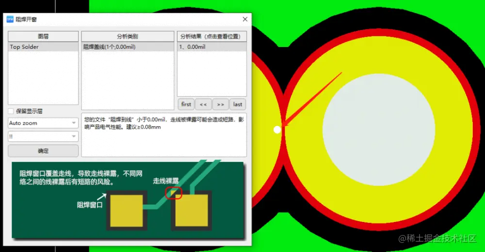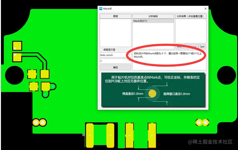我去,问题不少了。不过为了第一次单板主要是配合结构及测试功能,影响生产工艺的例如Mark点的、阻焊开窗、过控铜环的下板解决。还剩余一个检测到两个圈的是啥玩意得看看layout。