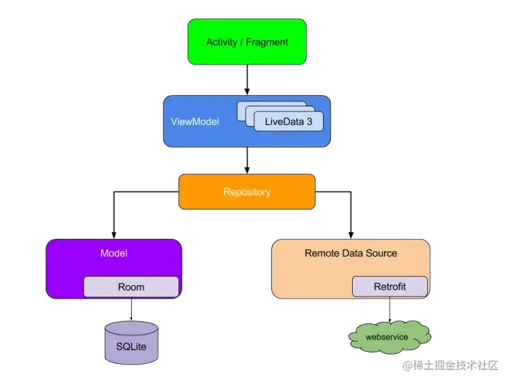 Google认为移动端应用的架构设计,最重要的 Separation of concerns(分离关注点)。上网找解释,其实它就是 模块解耦。下面是Google官方推荐的Android应用架构图: