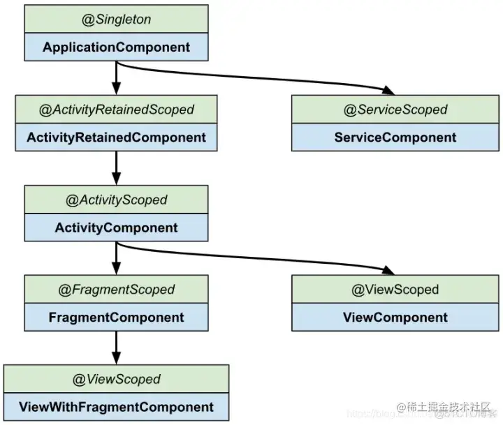 作用域也有自己的包含关系,比如被 @ActivityScoped声明的组件,可以在 Fragment 或者 View 中使用,他们的具体包含关系如下图所示: