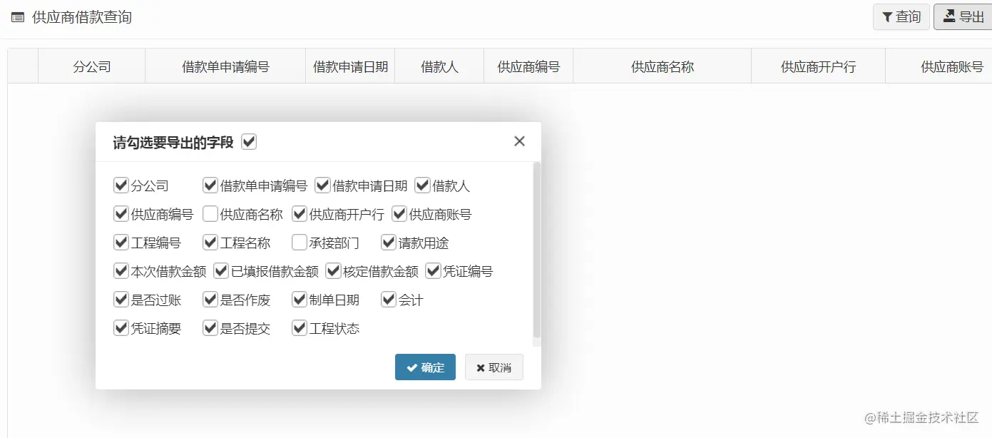 exportFieldNames 是将已勾选的字段的编码拼接成字符串,去传送到后台。