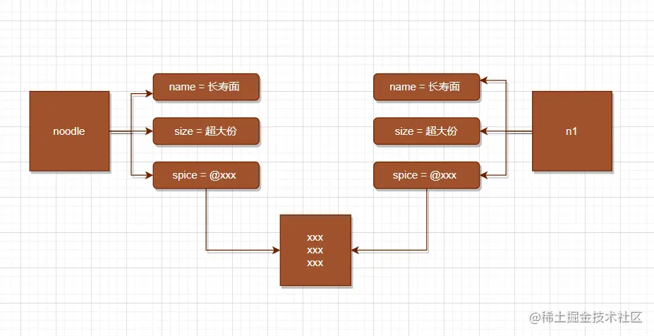 结构也是符合预期的,确实n1与n2的内容是和noodle一样。且它三个确实是存在三个对象而不是一个。