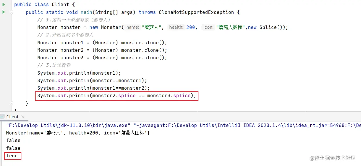 但这个Object提供的clone对于我们的需要来说其实是存在问题的,它虽然是新建了对象和我们上面自己实现的clone()一样,但新建对象的属性内容是直接赋值过去。也就是说如果属性是一个非基本类型。那么clone出来的对象里的这个属性和原型的对象里的这个属性是指向同一个对象。也就是说它是浅拷贝。