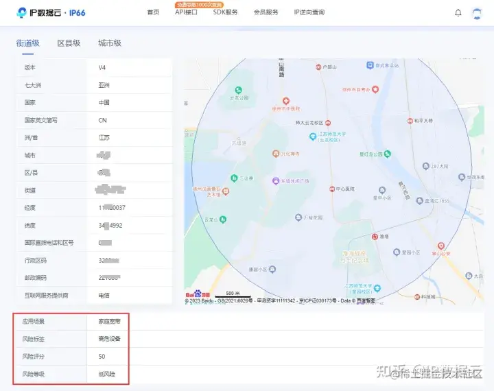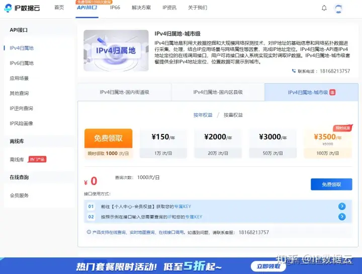 如果你想要免费的IPv4归属地API接口查询服务,页面上方点击“API接口”可以免费领取1000次/日的查询次数。
