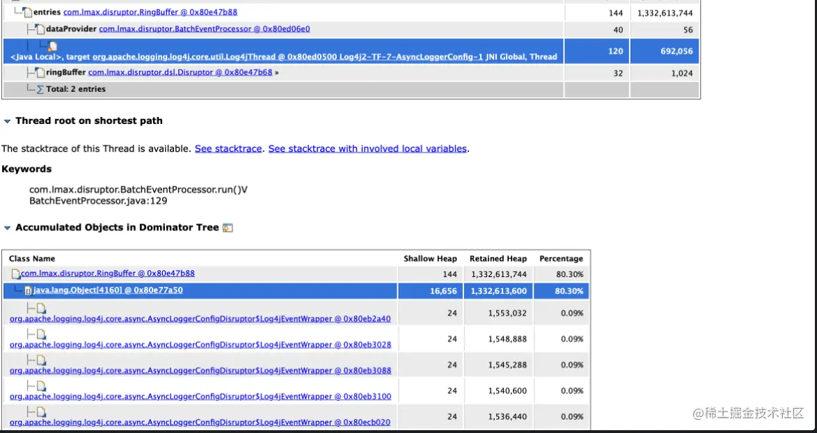 在Log4j中,我们采用异步方式进行磁盘写入,当打印日志时,Log4j先将日志通过Disruptor写入内存中,再由消费线程进行数据的落盘,而RingBuffer对象即是Disruptor框架中主要的数据存储对象。可以认定,上面所说的问题是内存数据写入过多,导致堆内存溢出