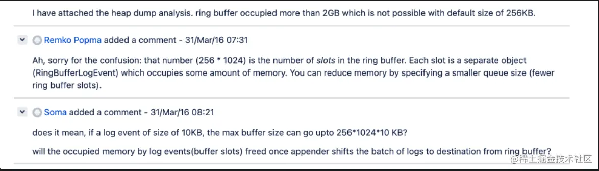 根据apache 的issues 可以看出,这个size并不是指对象的大小,而是Ringbuffer的插槽大小,每一条日志对应一个插槽,即当每条日志都有10K时,频繁打印日志填满插槽 可能会在内存 最多填充 10 * 1024 * 246 KB的内存。