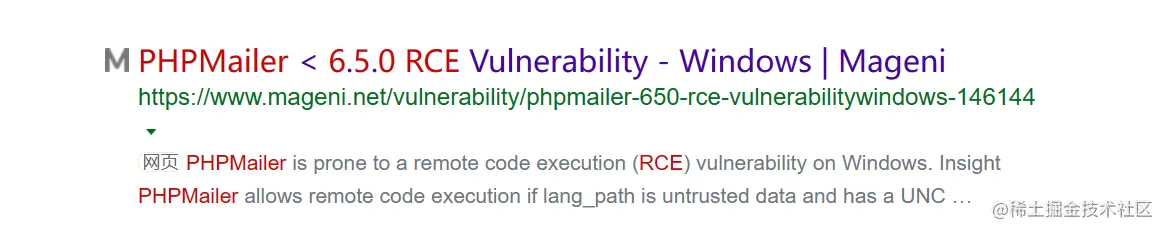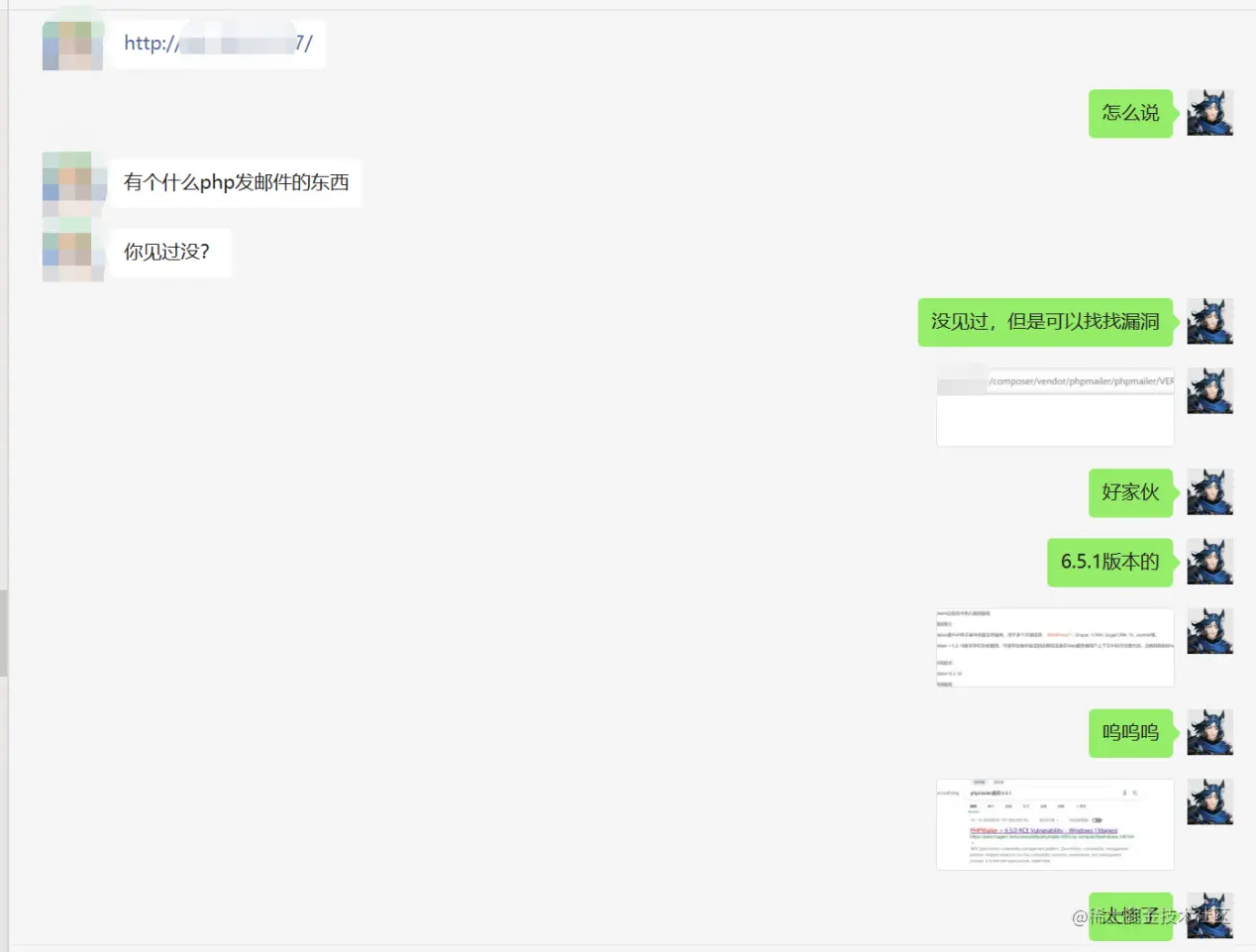 大概的意思就是,他在挖SRC的时候,发现一处资产存在目录遍历漏洞,它通过这个漏洞,找到目标资产使用了一个名为phpmailer的中间件(应该类似于中间件吧),问我有没有办法利用,我查了一下这个组件的漏洞信息。最新的洞似乎截止到6.5.0版本以前