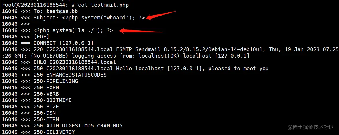 当前用户就是root,当前目录下只有testmail.php和test.php,毫无疑问,我们的恶意代码已经被成功执行了。