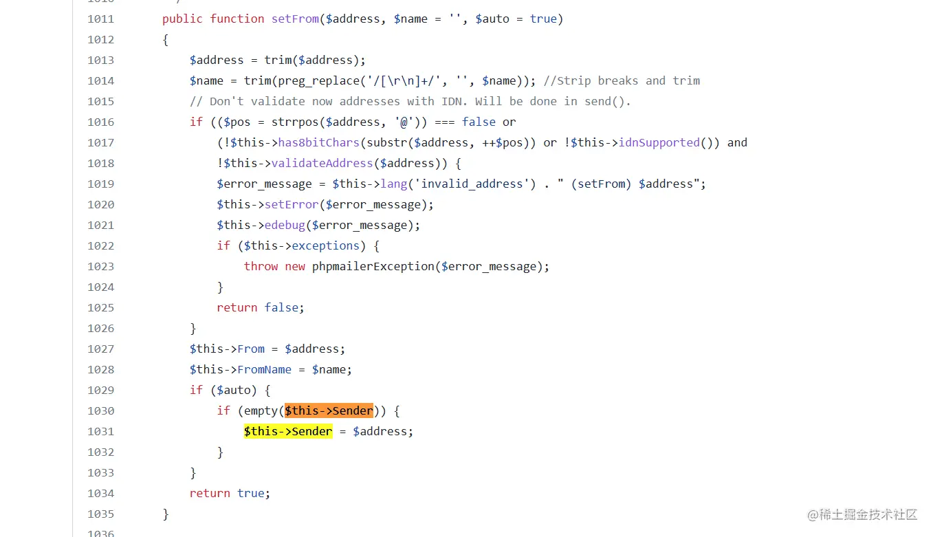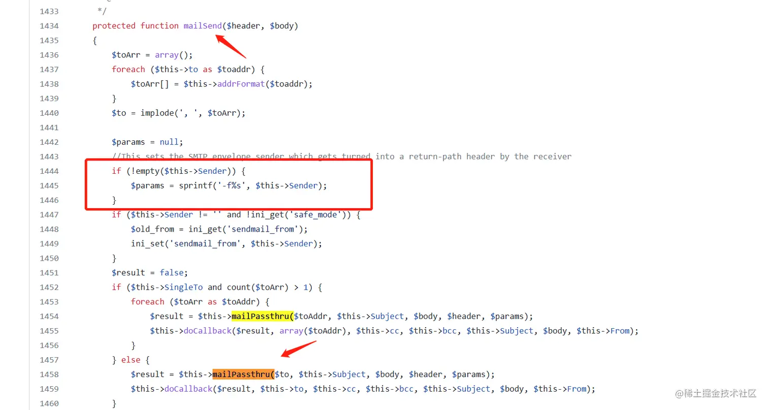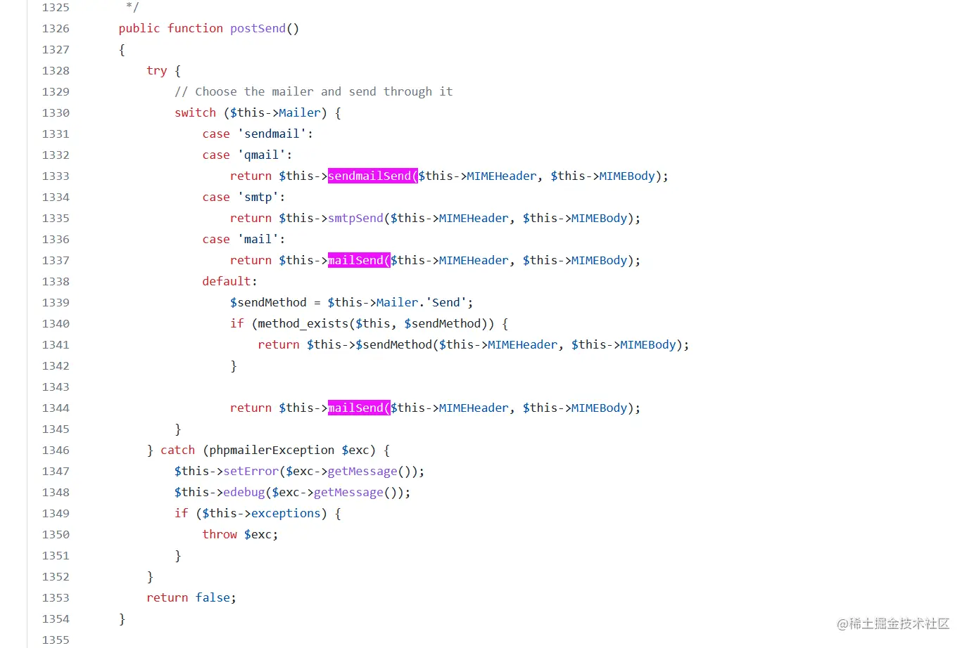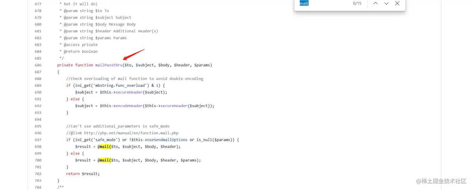 看到phpmailer的代码。这里先开门见山地说,漏洞的成因其实就在mail()函数的第五个参数,只要控制了第五个参数,我们就能进行RCE、文件读取等操作。因此我们先追溯mail()函数: