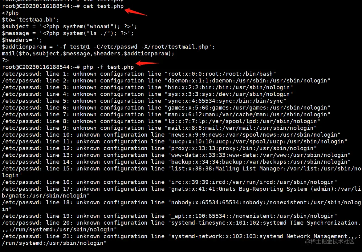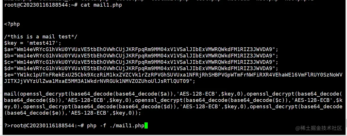 比如我在自己的服务器上运行如下代码,我们假设网站根目录是/root/,我们运行一下上述代码看看会发生什么。(在复现的时候确保你已经安装过sendmail,不然没用)。