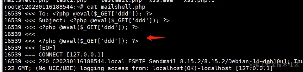 其实他的内容很多,就是日志文件。但是看箭头指的地方,毫无疑问,我们的代码已经被成功写入了。这时候如果我们再用php来执行这个testmail.php,注意看前后的区别