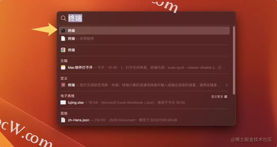 打开终端(快捷键:command+空格 聚焦搜索:终端),