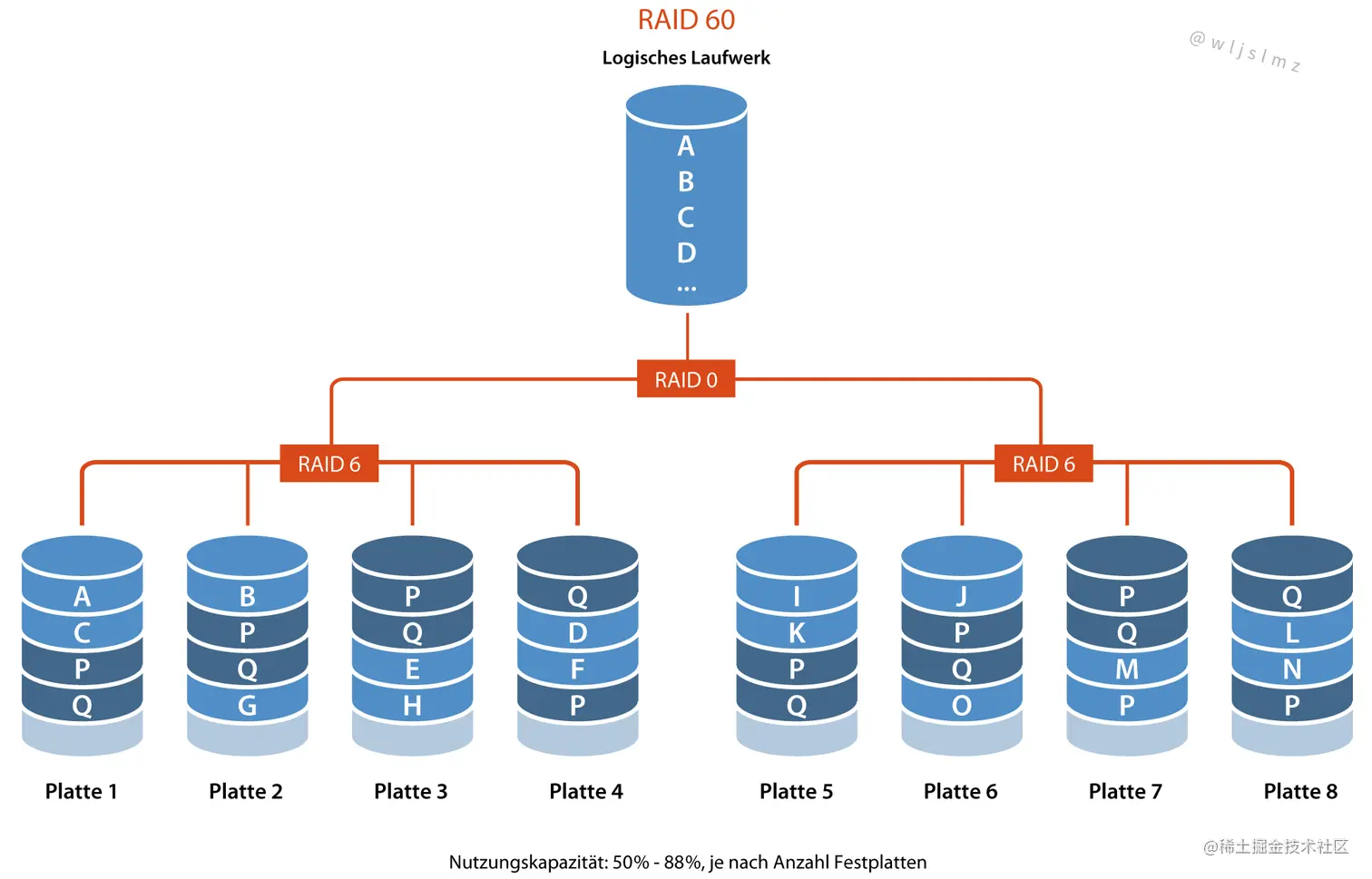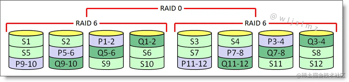 RAID 60 也称为带双分布式奇偶校验的跨区条带化: