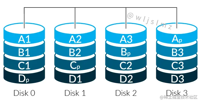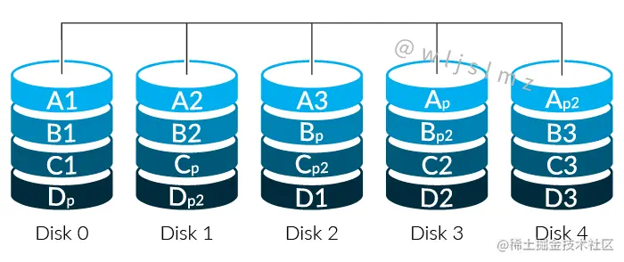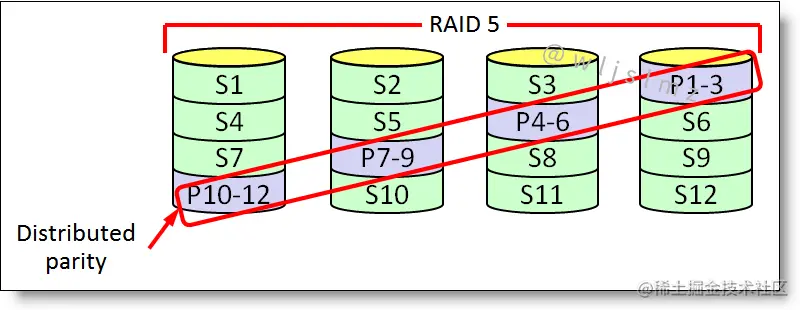 - 奇偶校验分布在阵列中的磁盘上