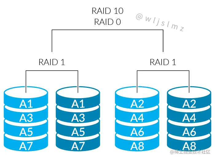 RAID 10 以相反的顺序将 RAID 1 和 RAID 0 组合在一起,有时,它也被称为“嵌套”或“混合”RAID,这是一种“两全其美的方法”,因为它具有 RAID 0 的快速性能和 RAID 1 的冗余性。在此设置中,多个 RAID 1 块相互连接,使其像 RAID 0。它用于在需要巨大磁盘性能(大于 RAID 5 或 6)以及冗余的情况下。