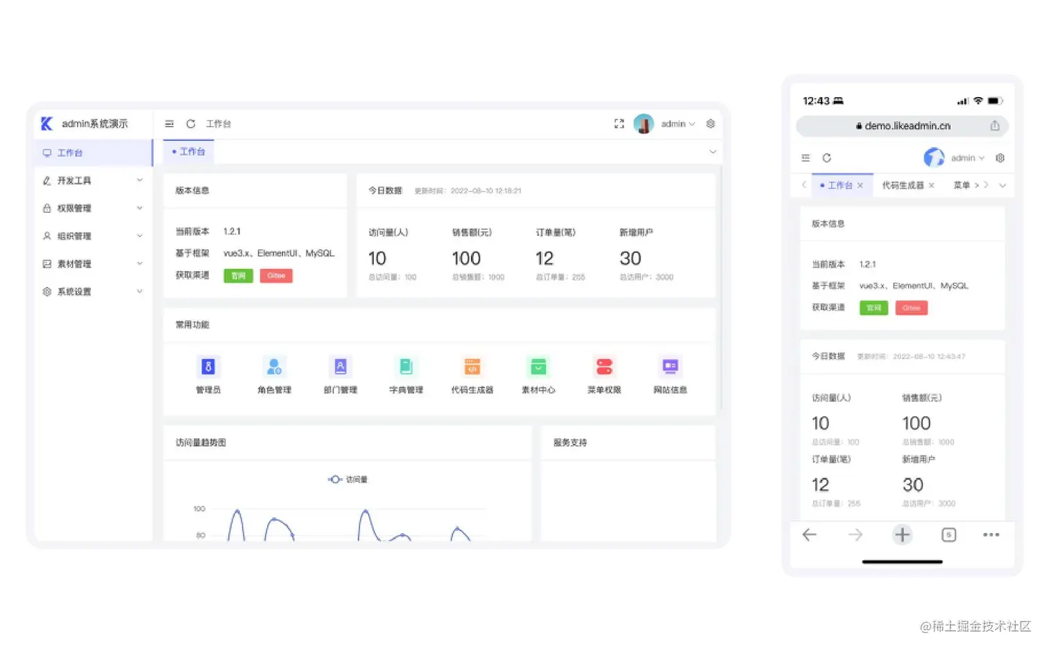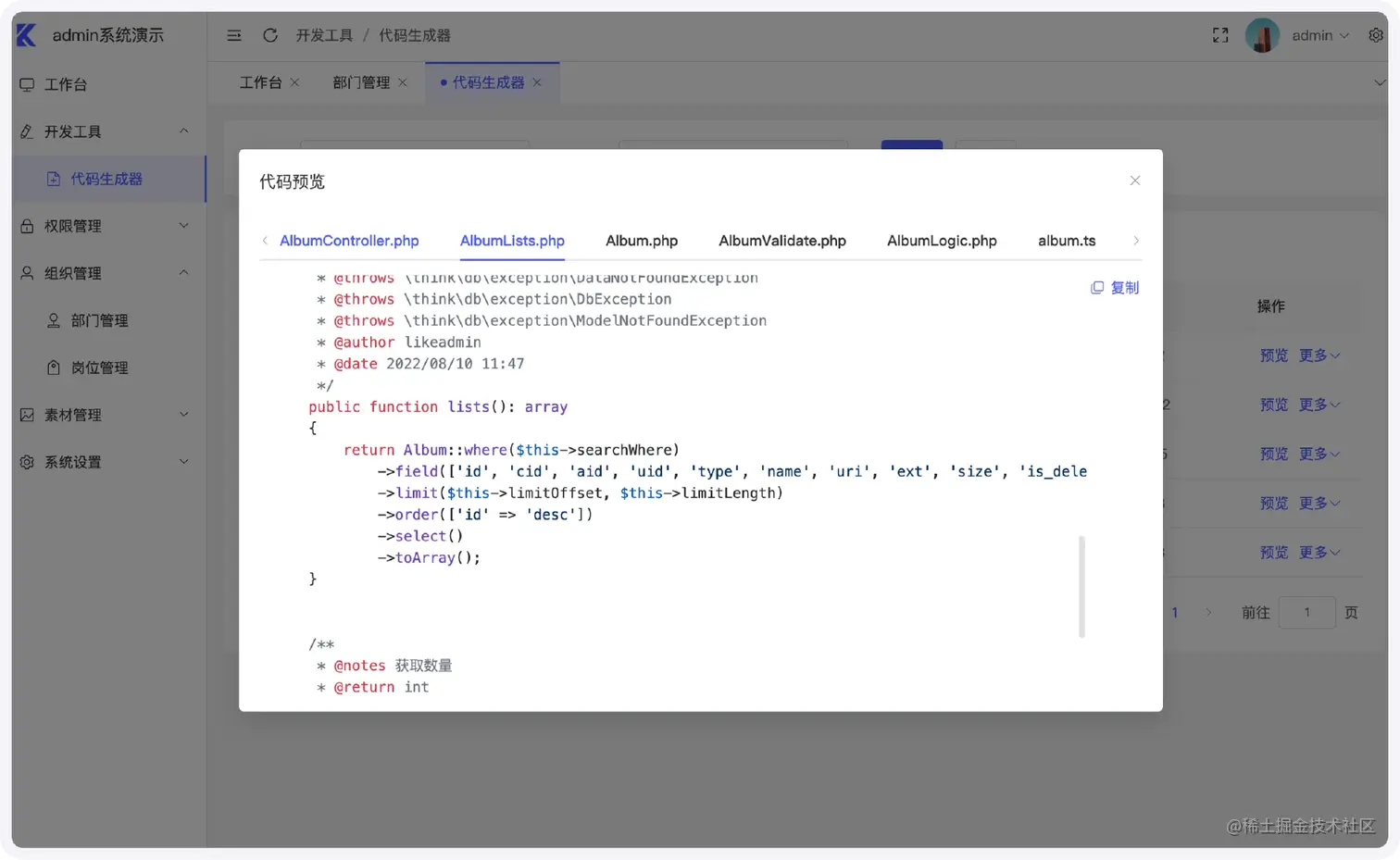 - likeadmin已经搭建好前后端分离的底层,包含程序安装、登录、登出、工作台、菜单权限控制、角色、管理员、部门管理、岗位管理、素材管理、网站设置、图库管理等基础功能,无需重复造轮子。更有开发者工具功能,一键生成代码,大大节省开发时间。