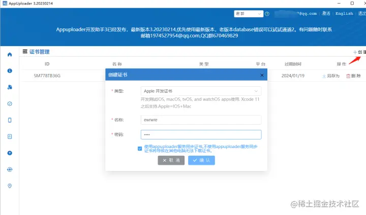 点击“添加”,新建一个证书文件(PS:推荐勾选密码下面的蓝字字体内容)