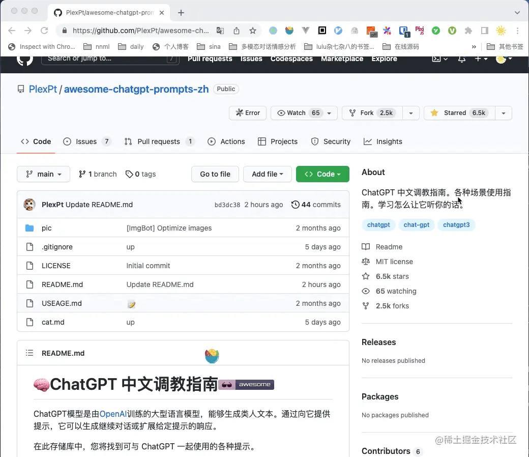再说个场景,当我们表达的不够清晰,不够明确时,ChatGPT 会回复一些错误、无关的答案,那么什么样的指令能更好的 “调教” 它? 🧠ChatGPT 中文调教指南 给了我们答案,这时由多位成员总结的开源项目, 里面详细的记录了不同场景下应该发什么指令。