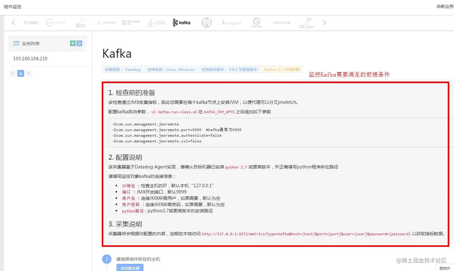 说明:需要监控其他组件时,组件监控首页点击进入该组件页面添加实例时会有相应的说明(以Kafka为例):