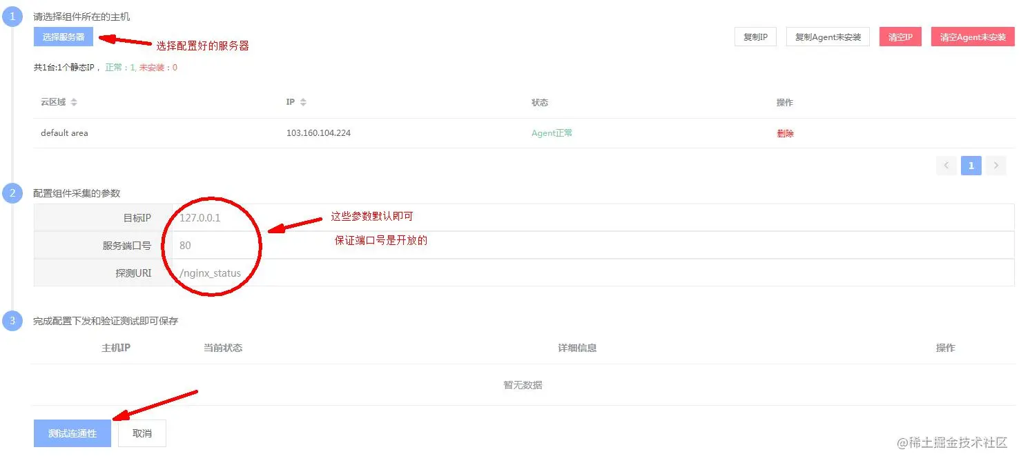 采集器将会根据你配置的内容,定期在本地访问 http://127.0.0.1/nginx_status ,以获取 Nginx的指标数据。