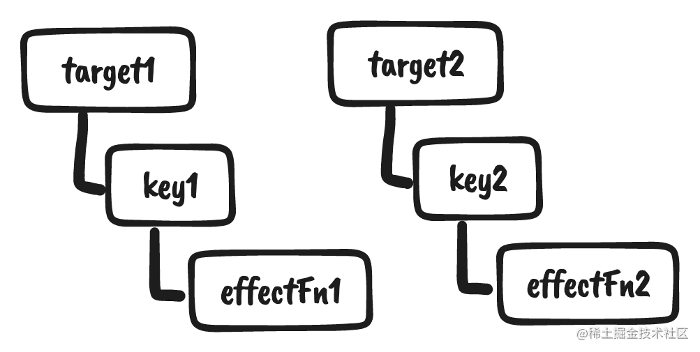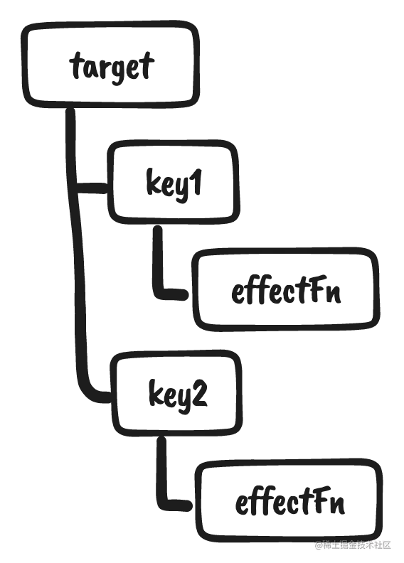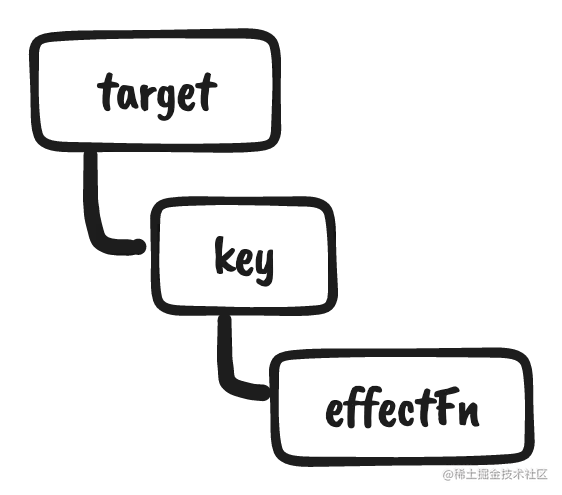 如果我们用target表示一个代理对象所代理的原始对象,用key表示被操作的字段,用effectFn表示被注册的副作用函数,那么我们可以为以上三元素建立如下关系: