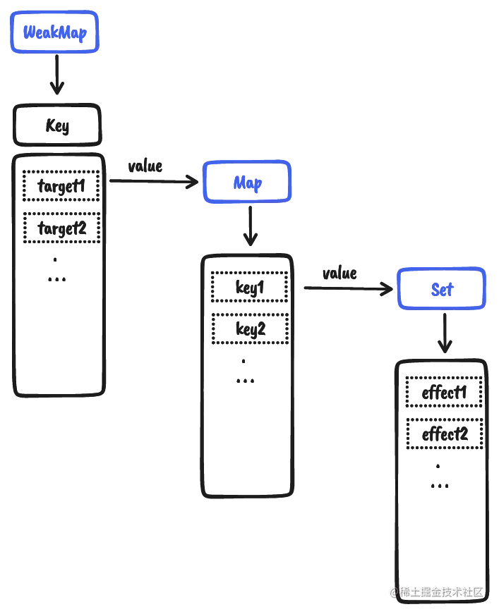 WeakMap的键是原始对象target,值是一个Map实例,而Map的键是原始对象target的key,值是一个副作用函数组成的Set。它们的关系如下图: