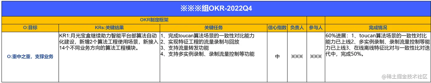 在执行KR的过程中,定期的交流是有必要的,有助于提前识别风险,方便管理者及时做决策;互相交流经验,提高KR执行的成功率。