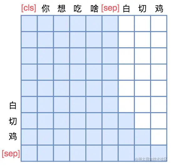 UniLM的核心是通过特殊的Attention Mask来赋予模型具有Seq2Seq的能力。假如输入是“你想吃啥”,目标句子是“白切鸡”,那UNILM将这两个句子拼成一个:[CLS] 你 想 吃 啥 [SEP] 白 切 鸡 [SEP],然后接如图的Attention Mask: