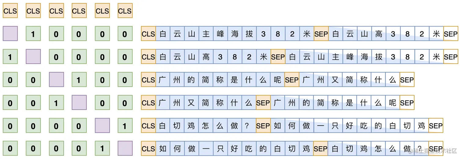 另一方面,把整个batch内的[CLS]向量都拿出来,得到一个bxd的句向量矩阵V(b是batch_size,d是hidden_size),然后对d维度做l2归一化,得到新的V,然后两两做内积,得到bxv的相似度矩阵VV^T,接着乘以一个scale(我们取了30),并mask掉对角线部分,最后每一行进行softmax,作为一个分类任务训练,每个样本的目标标签是它的相似句(至于自身已经被mask掉)。说白了,就是把batch内所有的非相似样本都当作负样本,借助softmax来增加相似样本的相似度,降低其余样本的相似度。