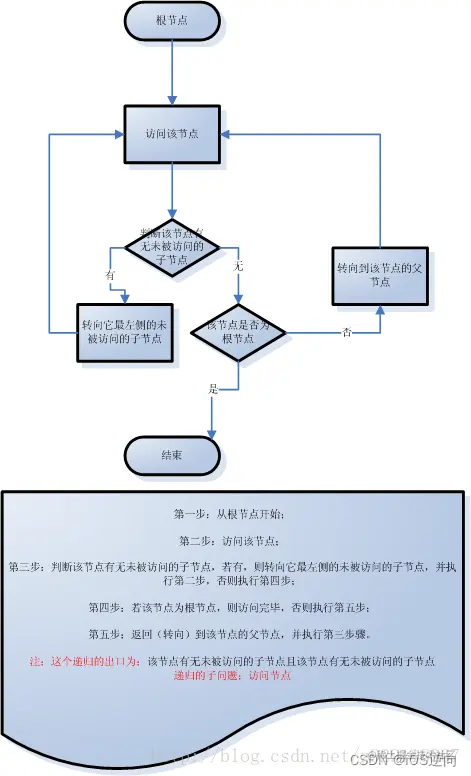 第四步:若该节点为根节点,则访问完毕,否则执行第五步;