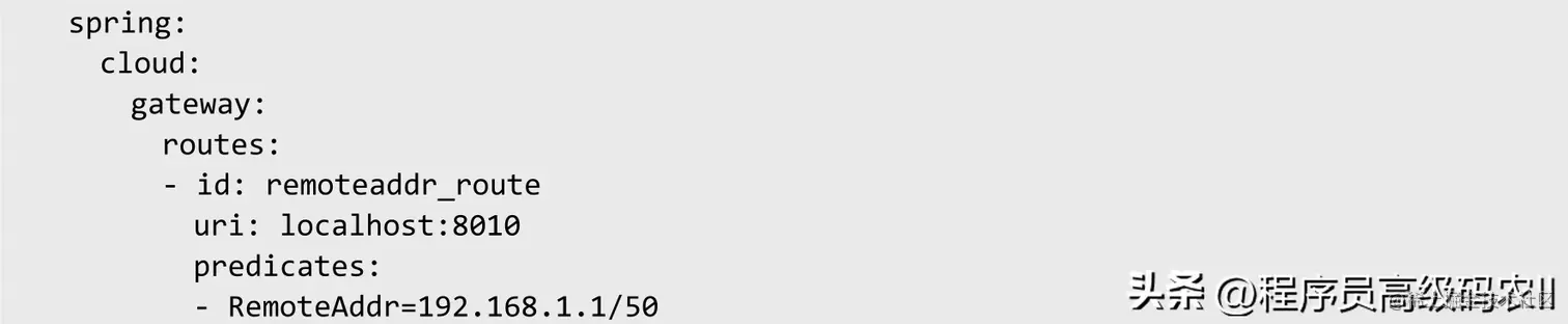 RemoteAddr Route Predicate Factory配置一个IPv4或者IPv6网段的字符串或者IP地址。当请求的IP地址在网段之内或者与配置的IP地址相同,匹配成功,则进行转发,否则不进行转发。