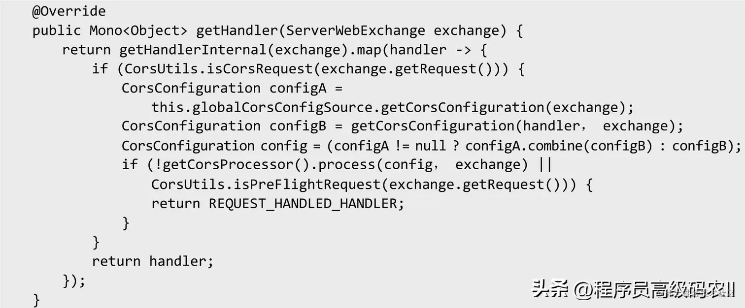 AbstractHandlerMapping 在 getHandler 方 法 中 封 装 了CORS(Cross-Origin Resource Sharing,跨域资源共享)。因为所有Handler都可能涉及CORS的处理,所以抽象类AbstractHandlerMapping提供了getHandlerInternal子类来实现查找Handler的具体方法。