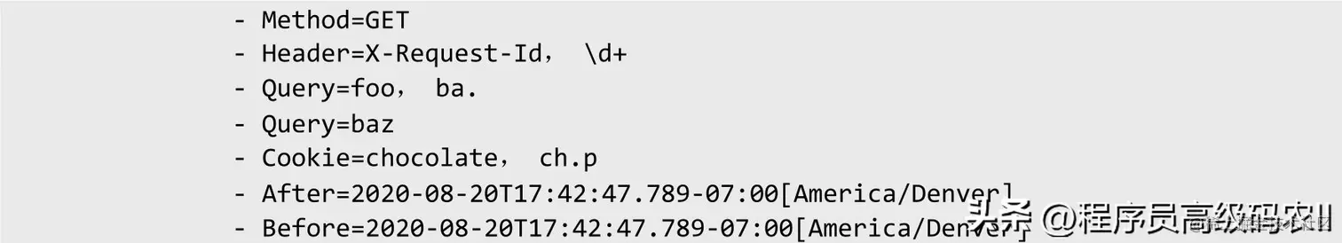 在上述配置文件中,如果多种Predicates同时存在于同一个路由,请求必须同时满足所有条件才能被这个路由匹配。当一个请求满足多个路由的Predicate条件时,请求只会被首个成功匹配的路由转发。下面分别对不同规则的路由匹配进行解释。