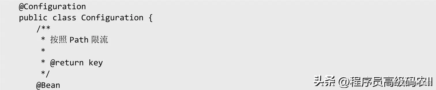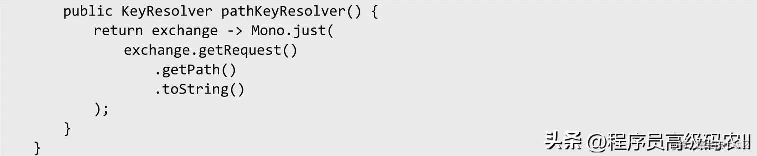 最后,完成对Path的KeyResolver(可以通过KeyResolver来指定限流的Key),实现对特定Path下的限流控制配置。在过滤器中可以配置一个可选的KeyResolver,KeyResolver在配置中根据名称使用SpEL引用Bean。#{@myKeyResolver}是引用名为“pathKeyResolver”的Bean的SpEL表达式。KeyResolver接口允许使用可插拔策略来派生限制请求的Key。代码如下: