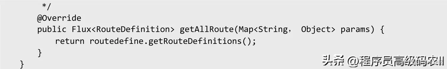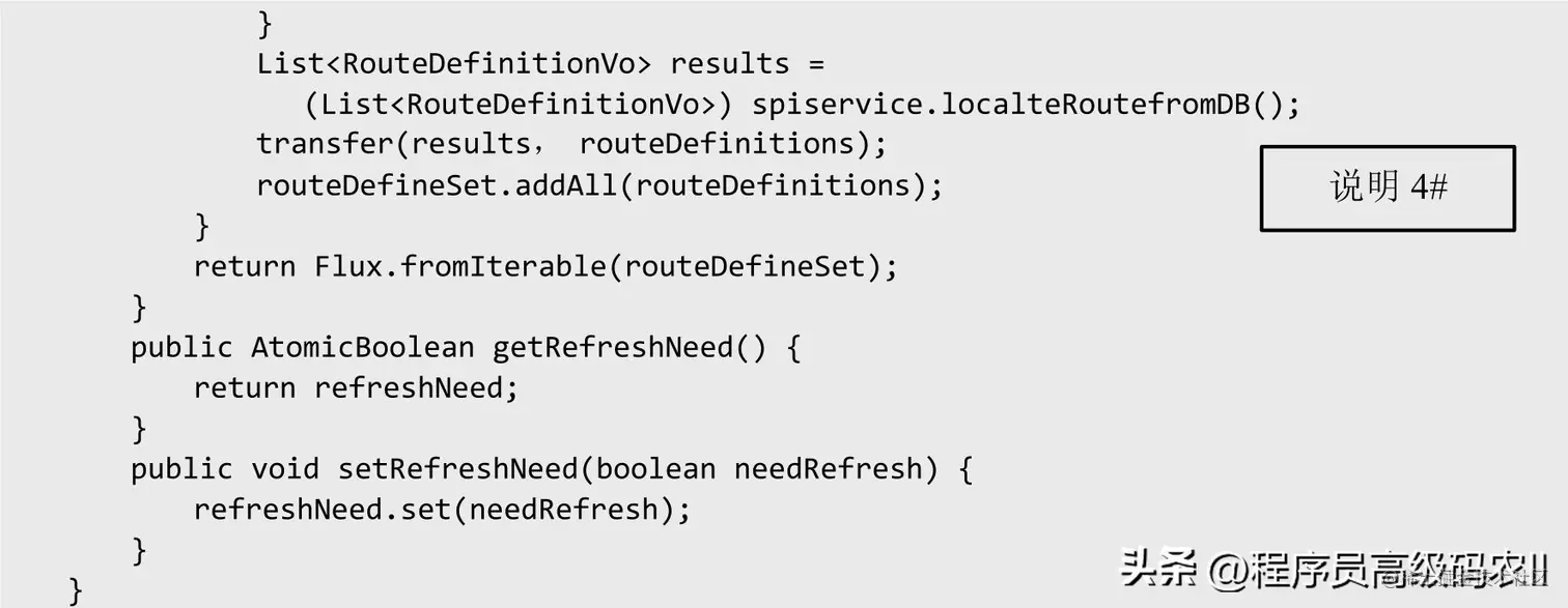 说明1#:在代码段中,refreshRoute方法是事件监听的入口方法,该方法会向Admin管理服务暴露一个REST服务。当Admin对路由进行更改后,会调用refreshRoute方法,触发Spring Cloud Gateway自带的RefreshRoutesEvent事件,同时设置原子布尔变量routedefine为true,在下面的动态路由加载中根据该原子布尔变量决定是从数据库中读取路由还是从缓存中读取路由。