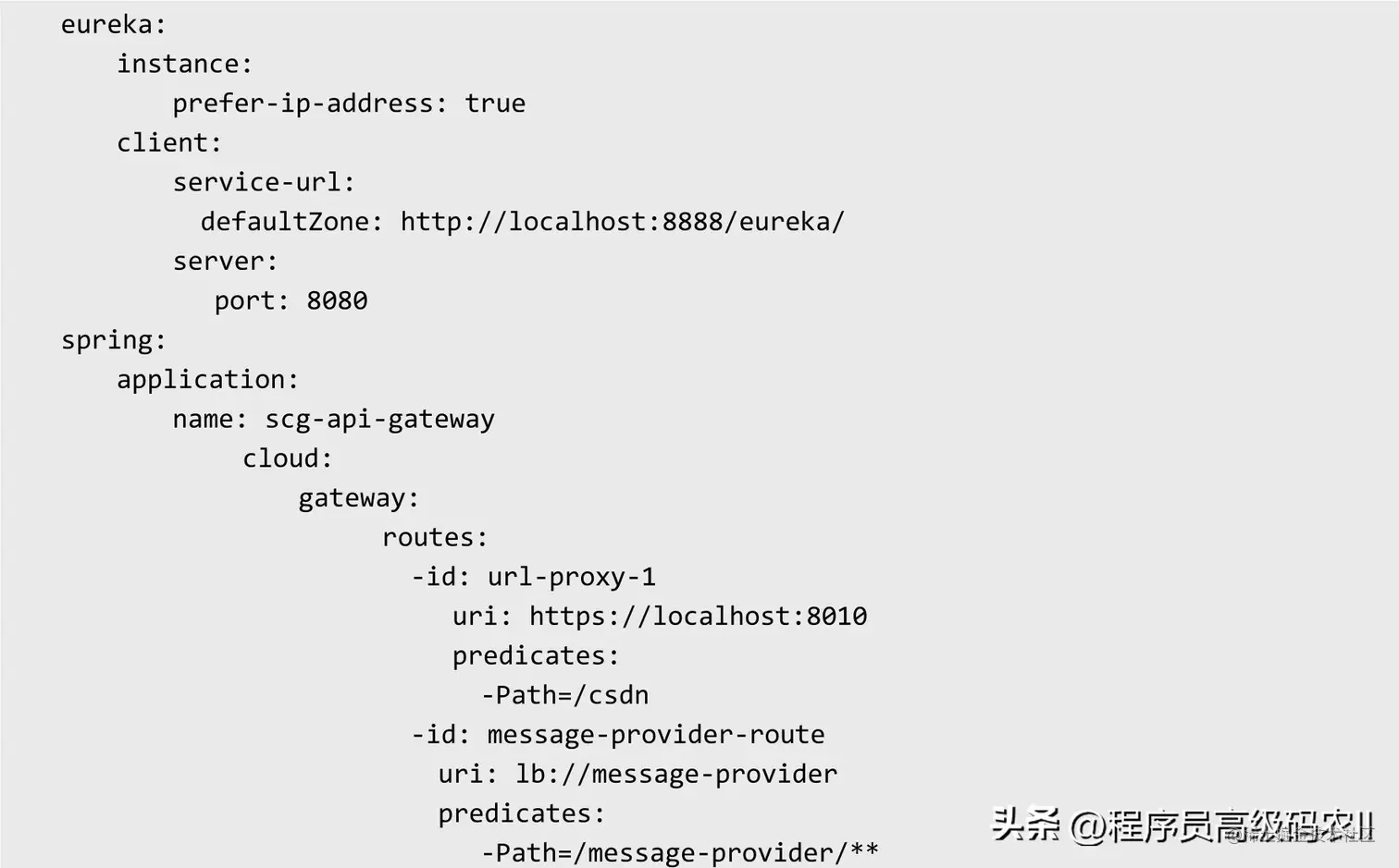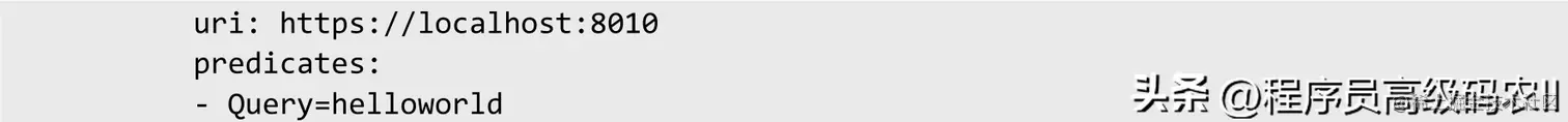 ○ 第一个Predicate基于URL的方式。配置文件的第一个路由的配置采用URL方式,配置了一个ID为url-proxy-1的URI代 理 规 则 。 路 由 的 规 则 为 : 当 访 问 地 址 为http://localhost:8080/csdn/1.jsp时,会路由到上游地址https://localhost:8010/1.jsp。○ 第二个Predicate基于服务ID发现的方式。配置文件的第二个路由的配置采用与注册中心相结合的服务发现方式,与单个URI的路由配置相比,区别其实很小,仅在于URI的schema协议不同。单个URI地址的schema协议,一般为HTTP或者HTTPs协议。