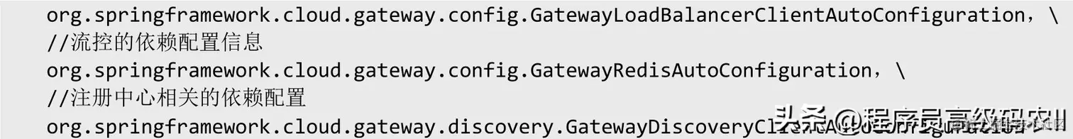 可 以 看 到 Spring Cloud Gateway 的 Starter 启 动 类 主 要 依 赖spring-cloud-gateway-core组件。使用EnableAutoConfiguration注解完成自动配置初始化信息,我们在Spring Cloud Gateway下的spring.factories(在包spring-cloud-gateway-core)声明文件如下:
