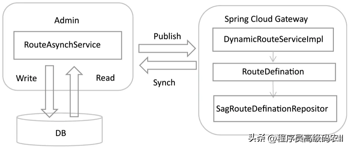 ● 通过实现RouteDefinitionRepository接口,实现自定义的Repository类,实现从数据库或者缓存中动态加载路由信息的功能。架构模式与Zuul的动态路由采用相似的路由加载策略,架构流程图如下。