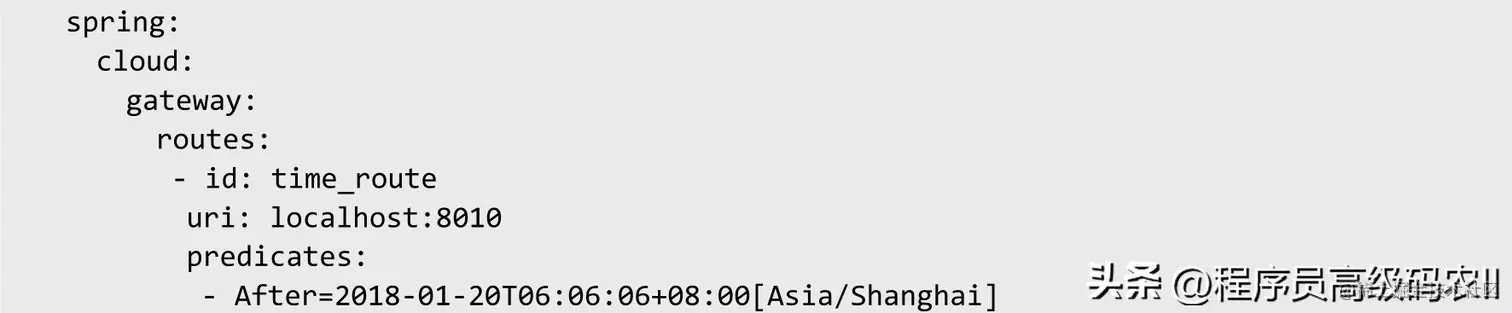 设置时间后断言:从After Route Predicate Factory中获取一个UTC时间格式的参数,当请求的当前时间在配置的UTC时间之后,则成功匹配,否则不能成功匹配。下面是实例配置: