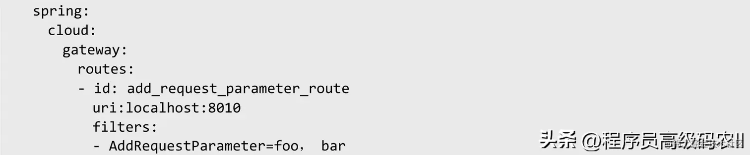AddRequestParameter GatewayFilter Factory采用一对名称和值作为参数,配置参数application.yml如下: