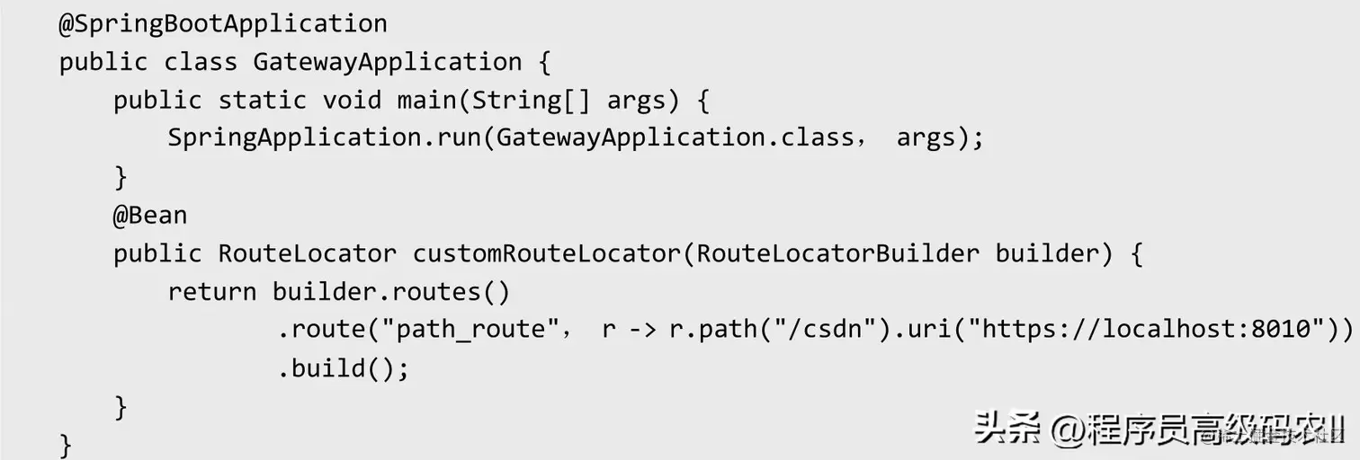 路由转发功能同样可以通过代码来实现,我们可以在启动类GatewayApplication中添加customRouteLocator方法来定制转发规则,代码如下: