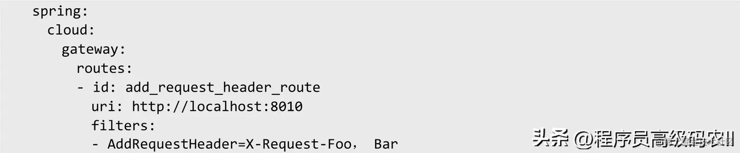 AddRequestHeader GatewayFilter Factory采用一对名称和值作为参数,配置文件application.yml如下: