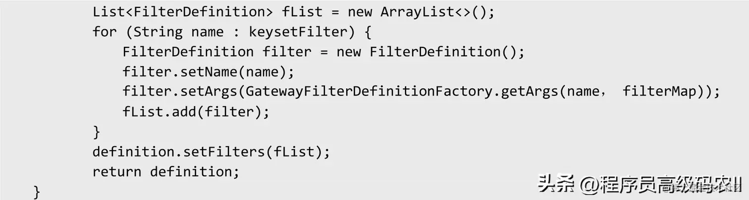 GatewayPredicateDefinitionFactory完成过滤器的模式匹配转换。FilterDefinition是过滤器的模型定义,定义name为Key、args为Value。举例如下: